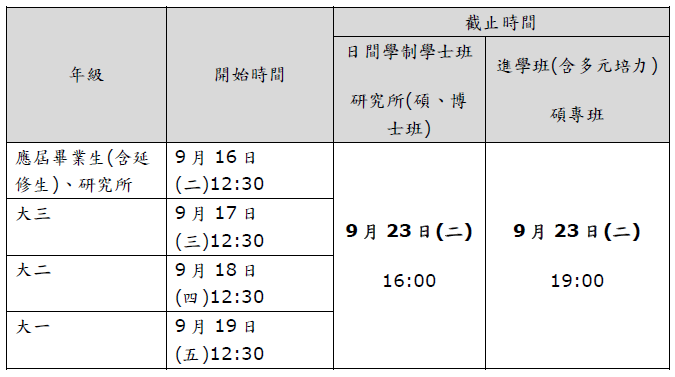 (二)系統開放日期:9月16日(二)至9月23日(二),依年級開放。